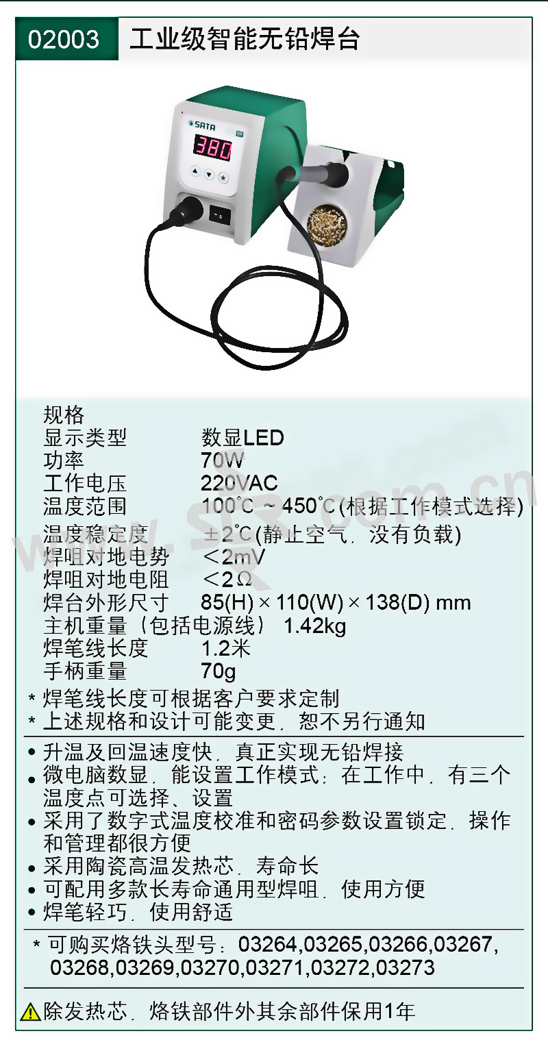 ·升温及回温速度快,真正实现无铅焊接。·微电脑数显,能设置工作模式,在工作中,有三个温度点可选择、设置。·采用了数字式温度校准和密码参数设置锁定,操作和管理都很方便。·采用陶瓷高温发热芯,寿命长。·可配合多款长寿命通用型焊嘴,使用方便。·焊笔轻巧,使用舒适。
