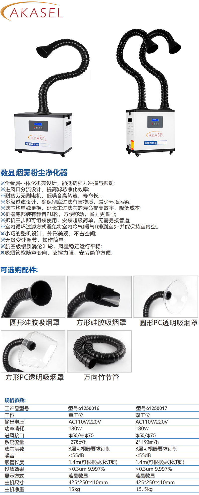 ·全金属- -体化机壳设计,能抵抗强力冲撞与振动; ·小巧的整机设计,外形美观,不占空间; ·进风口分流设计、提高滤芯净化效率; ·无级变速调节,操作简单; ·耐疲劳无刷电机,低噪音高转速、寿命长; ·航空级铝质涡沦叶轮,风量稳定运行平稳; ·多级过滤设计,确保彻底过滤有害物质,减少环境污染; ·吸烟管能随意变向、支撑力强,安装简单方便; ·滤芯均单独更换,延长主过滤芯的寿命提高效率,降低成本; ·机器底部装有静音PU轮,方便移动,省力更省心; ·拆机三步即可组装使用,安装超级简单,无需另接管道;