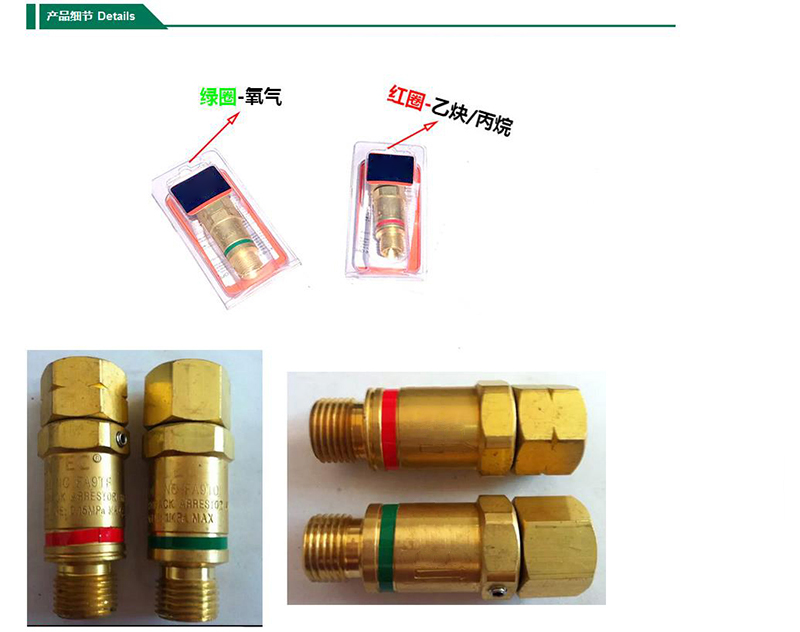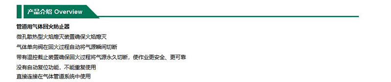 ·微孔散热型火焰熄灭装置确保火焰熄灭 ·气体单向阀在回火过程自动将气源瞬间切断 ·带有温控截止装置确保回火过程将气源永久切断,使作业更安全、更可靠 ·没有自动复位功能,不能重复使用 ·直接连接在气体管道系统中使用