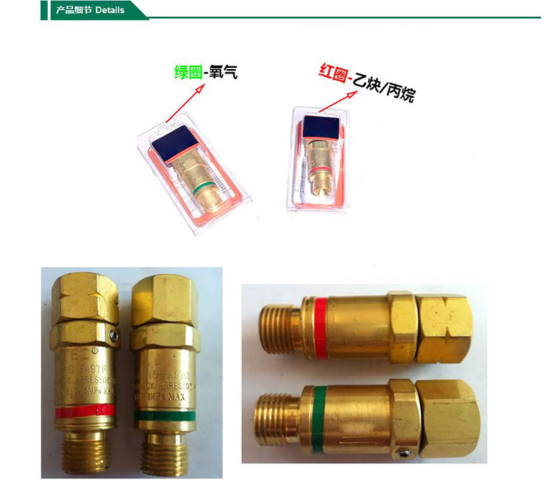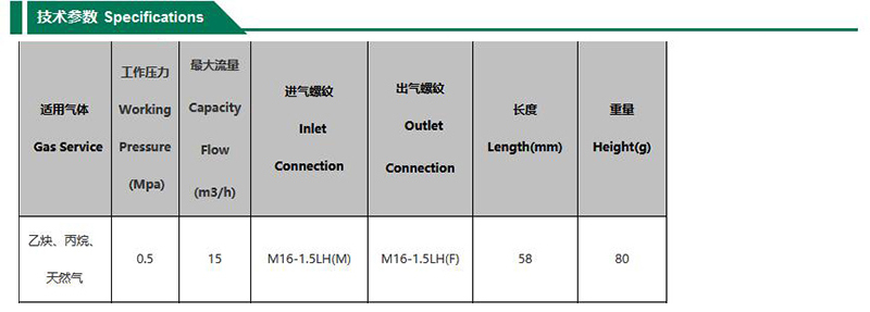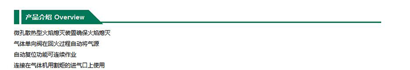 ·微孔散热型火焰熄灭装置确保火焰熄灭 ·气体单向阀在回火过程自动将气源 ·自动复位功能可连续作业 ·连接在气体机用割炬的进气口上使用