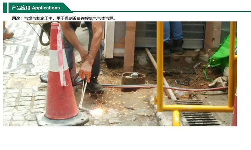 ·胶管胶层采用专用的橡胶材料依照氧气管的使用特点而设计,内胶采用气密性能良好材料,使胶管的内层具有优良的密闭性能,保证胶管在承受高压力的情况下不泄漏,从而保证胶管的承压能力,外胶采用具有良好的耐老化性能和阻燃性能的橡胶材料,能长期在户外日晒、潮湿、霜冻阴冷等复杂的施工环境中具有良好的老化性能,具有一定的阻燃性能,能抵御施工中火星及高温焊渣对管体的灼烫,这是PVC等材质的氧气管所不具备的性能