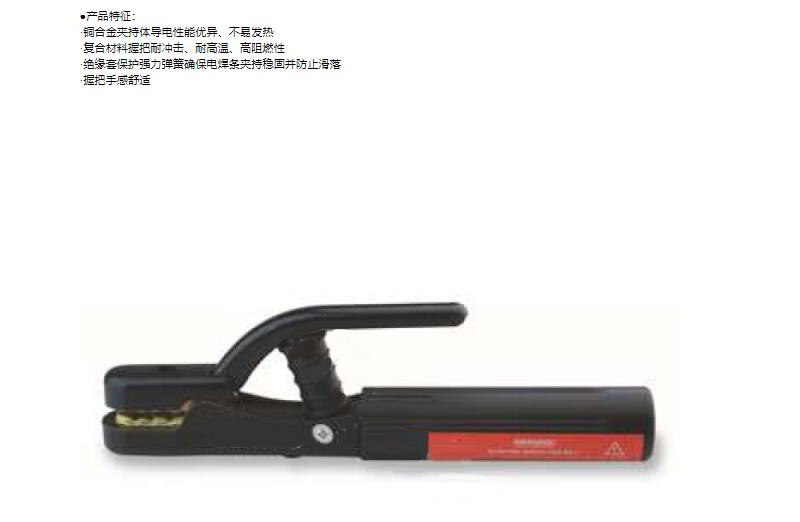 ·铜合金夹持体导电性能优异、不易发热 ·复合材料握把耐冲击、耐高温、高阻燃性 ·绝缘套保护强力弹簧确保电焊条夹持稳固并防止滑落 ·握把手感舒适