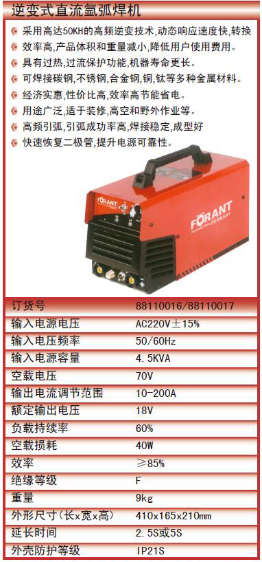 ·采用高达50KH的高频逆变技术,动态响应速度快,转换 效率高 ·产品体积和重量减小,降低用户使用费用。 ·具有过热,过流保护功能,机器寿命更长。 ·经济实惠,性价比高,效率高节能省电。 ·用途广泛·适于装修,高空和野外作业等。 ·高频引弧,引弧成功率高,焊接稳定,成型好 ·快速恢复二极管,提升电源可靠性。
