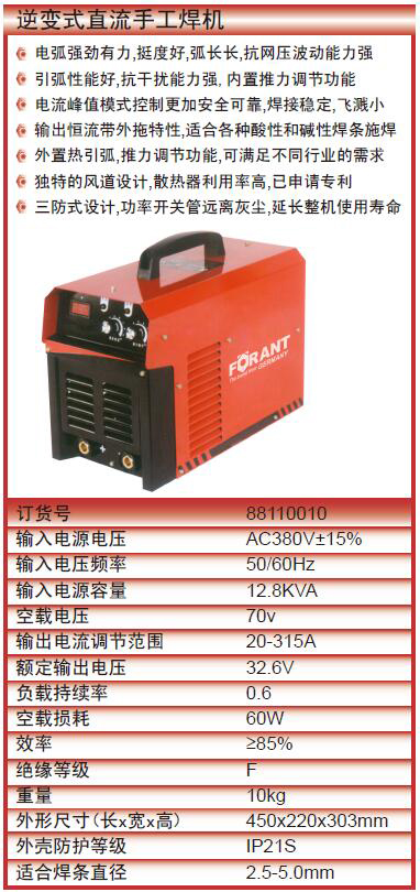 ·电弧强劲有力,挺度好,弧长长,抗网压波动能力强 ·引弧性能好,抗干扰能力强,内置推力调节功能 ·电流峰值模式控制更加安全可靠,焊接稳定,飞溅小 ·输出恒流带外拖特性,适合各种酸性和碱性焊条施焊 ·外置热引弧,推力调节功能,可满足不同行业的需求 ·独特的风道设计,散热器利用率高,已申请专利 ·三防式设计,功率开关管远离灰尘,延长整机使用寿命