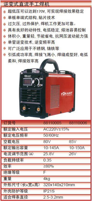 订货号 制造商型号 额定焊接电流 输入电压 额定输入电流 额定电源容量 电流调节范围 额定暂载率 净重 标准附件 额定电压频率 空载电压 负载持续率 效率 绝缘等级 外形尺寸(长x宽x高) 外壳防护等级 价格 购物车
