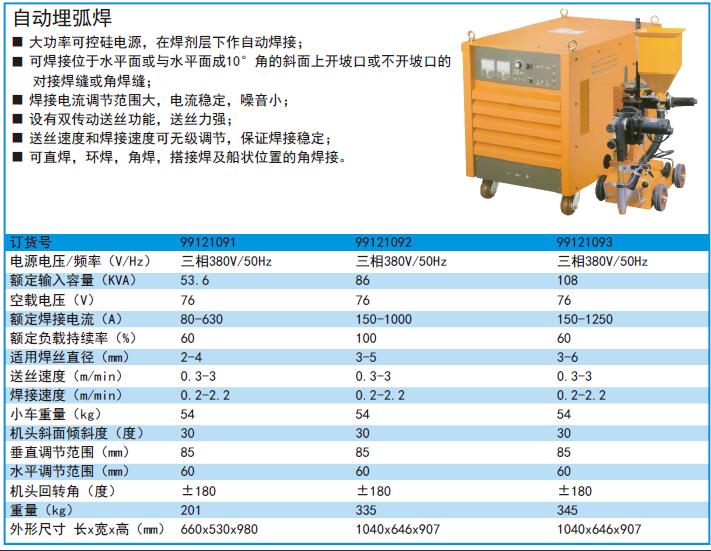 ·大功率可控硅电源,在焊剂层下作自动焊接; ·可焊接位于水平面或与水平面成10°角的斜面上开坡口或不开坡口的对接焊缝或角焊缝; ·焊接电流调节范围大,电流稳定,噪音小; ·设有双传动送丝功能,送丝力强; ·送丝速度和焊接速度可无级调节,保证焊接稳定; ·可直焊,环焊,角焊,搭接焊及船状位置的角焊接。