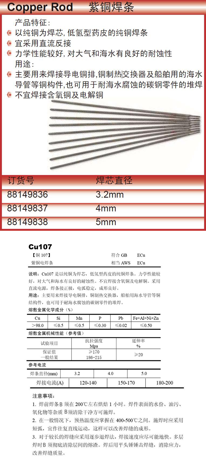 规格:  Cu107 4. 0mm 6kg/包 制造商型号:  88149837