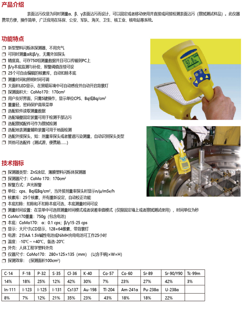 ·新型塑料闪烁体探测器,不用充气 ·可同时测量α和β/y,无需外加探头 ·精度高,可存750组测量数据并且可以传输到PC上 ·β/y本底监测与补偿,报警阈值连续可设 ·25个可自由编辑的核素库,自动扣除本底 ·测量时间和照明时间可调 ·大面积LED显示,在黑暗环境中可自动感应并自动开启背景灯 ·探测面积大:CoMo170: 170cm² ·用户友好界面,只需5键操作,显示单位CPS、Bq或Bq/cm² ·重量轻,密码保护高级菜单 ·选配软件读取测量数据 ·选配墙壁固定装置可用于检测手部沾污 ·选配擦拭配件