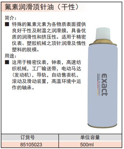 ·特殊的氟素元素为各物质表面提供良好干性及耐温之润滑膜,具备优质的润滑性和挤压性。 ·适用于精密仪表、塑胶机械之顶针润滑及惰性塑料的脱模。