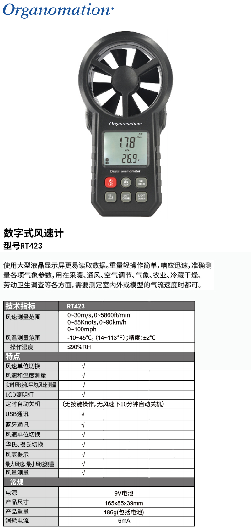 LX10512 RT424 0~30m/s 、0~5860ft/min、 0~55knots、 0~90km/h、0~65mph ±5%±0.1、±5%±20、±5%±0.2、±5%±0.4、±5%±0.2 温度测量:-10℃~+45℃ 、14℉~113℉ ±2℃/±3.6℉ 同时测量风速和风温 137.20