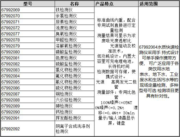 ·标准曲线内重,配合专用试刑直接进行定量检测 ·测量结果可星示为浓度吸光度透射比 ·先进的光源驱动及校准技术, ·低功耗设计。内置大容里可充电理电池, ·超长待机时间·检测数据可存储,使携式设计。·光源超高亮发光二极管·测量部件:专用比色管·100%噪声<=05%T0%噪声<=0.2%t漂移<=0.4%t+30min·量示/输人液晶显示屏,键盘