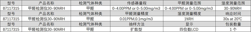 订货号 制造商型号 测量范围 检测气体种类 传感器量程 甲醛测量范围 湿度测量范围 甲醛测量精度 湿度测量精度 响应时间 抽样方法 显示 包装数量 价格 购物车