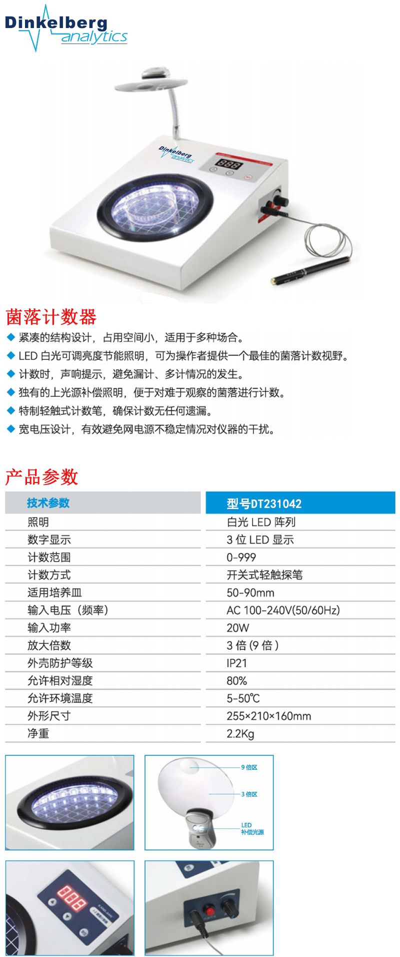 LX109175 DT231042 菌落计数器 ·照明:白光LED 阵列 ·数字显示:3 位LED 显示 ·计数范围:0~999 ·计数方式:开关式轻触探笔 ·外形尺寸:255x210x160mm 1399.20