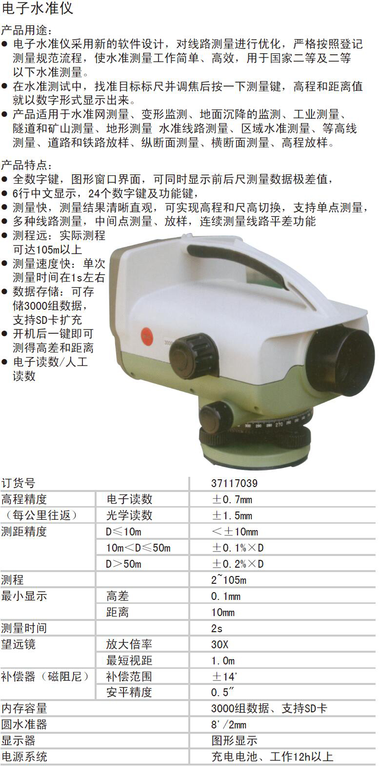 ·产品用途: ·电子水准仪采用新的软件设计,对线路测量进行优化,严格按照登记测量规范流程,使水准测量工作简单、高效,用于国家二等及二等以下水准测量。 ·在水准测试中,找准目标标尺并调焦后按一下测量键,高程和距离值就以数字形式显示出来。 ·产品适用于水准网测量、变形监测、地面沉降的监测、工业测量、隧道和矿山测量、地形测量 水准线路测量、区域水准测量、等高线测量、道路和铁路放样、纵断面测量、横断面测量、高程放样。 ·产品特点: ·全数字键,图形窗口界面,可同时显示前后尺测量数据极差值, ·6行中文显示,24个数字键及功能键, ·测量快,测量结果清晰直观,可实现高程和尺高切换,支持单点测量, ·多种线路测量,中间点测量、放样,连续测量线路平差功能 ·测程远:实际测程可达105m以上 ·测量速度快:单次测量时间在1s左右 ·数据存储:可存储3000组数据,支持SD卡扩充 ·开机后一键即可测得高差和距离 ·电子读数/人工读数