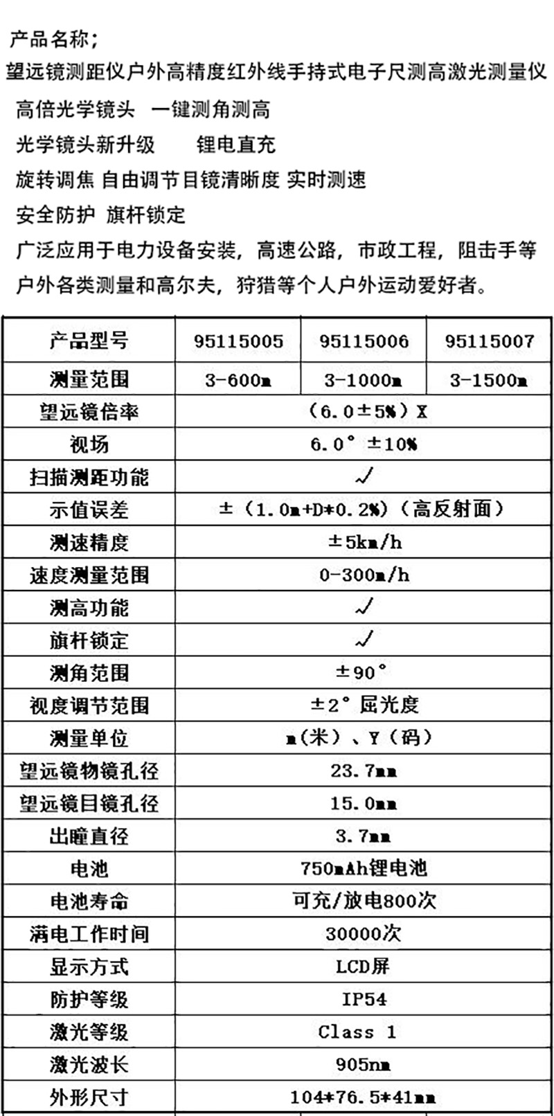 望远镜高精度红外线激光测量仪 95115006 测量范围3~1000m 1个