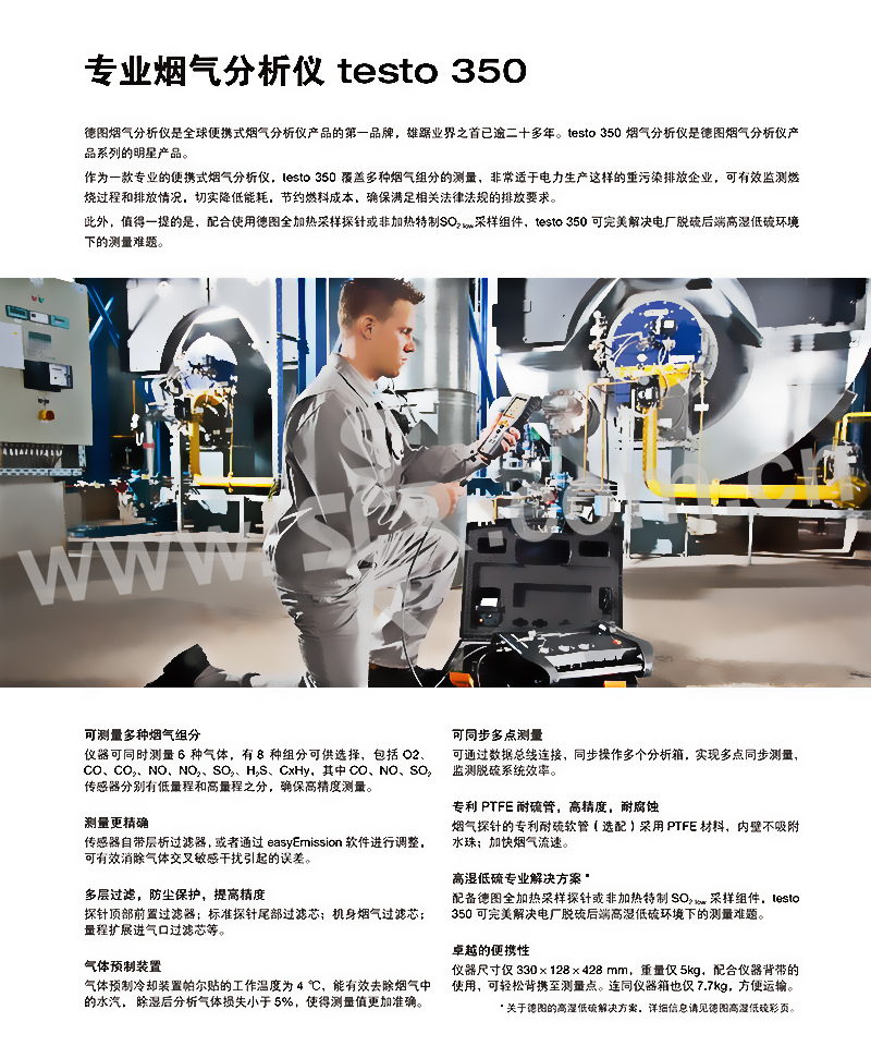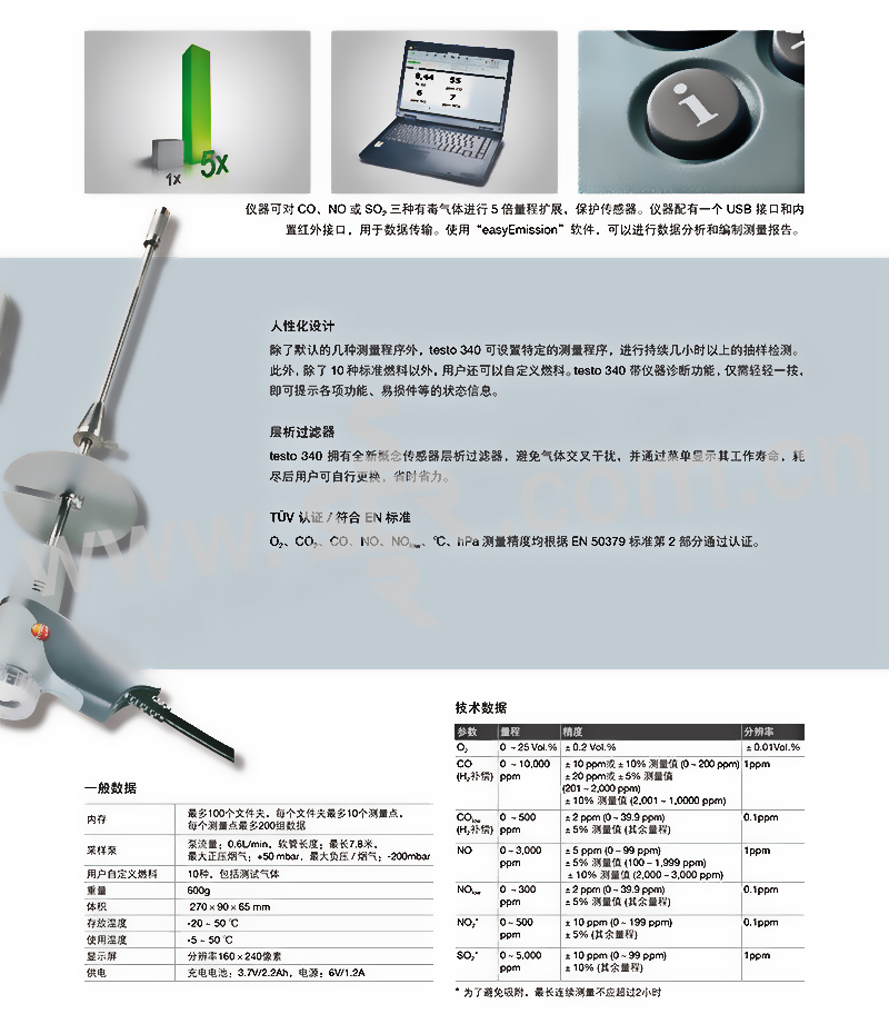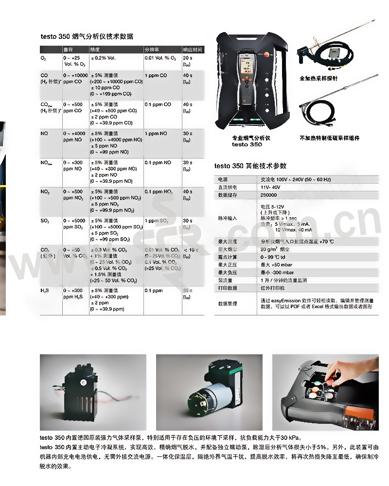 ·0632 3521---350手操器 ·0632 3520---350分析箱,O2量程0 ~ +25 Vol.%,新鲜空气阀 空气预处理,CO(H2)量程0 ~ +10000 ppm ,NO2量程 0 ~ +500 ppm ,NO量程 0 ~ +4000 ppm ,SO2量程 0 ~ +5000 ppm ·0554 3381---350分析箱过滤芯 ·0554 1096---电源适配器 6,3VDC 2A ·0554 3334---350软件 ·051