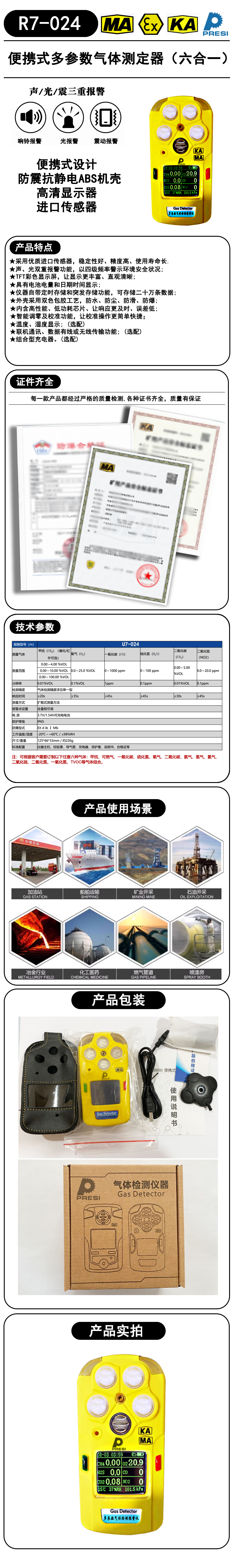 规格:  甲烷(催化/红外可选):0.00~4.00%VOL;0.00~10.00%VOL;0.00~100.00%VOL氧气:0.0~25.0%VOL一氧化碳:0~1000ppm硫化氢:0~100.0ppm二氧化碳:0.00~5.00%VOL二氧化氮:0.0~20.0ppm 制造商型号:  R7-024