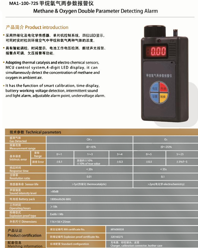 ·采用热催化及电化学传感器、单片机控制系统,四位LED显示,可同时实时检测环境空气中甲烷和氧气两种气体的浓度。