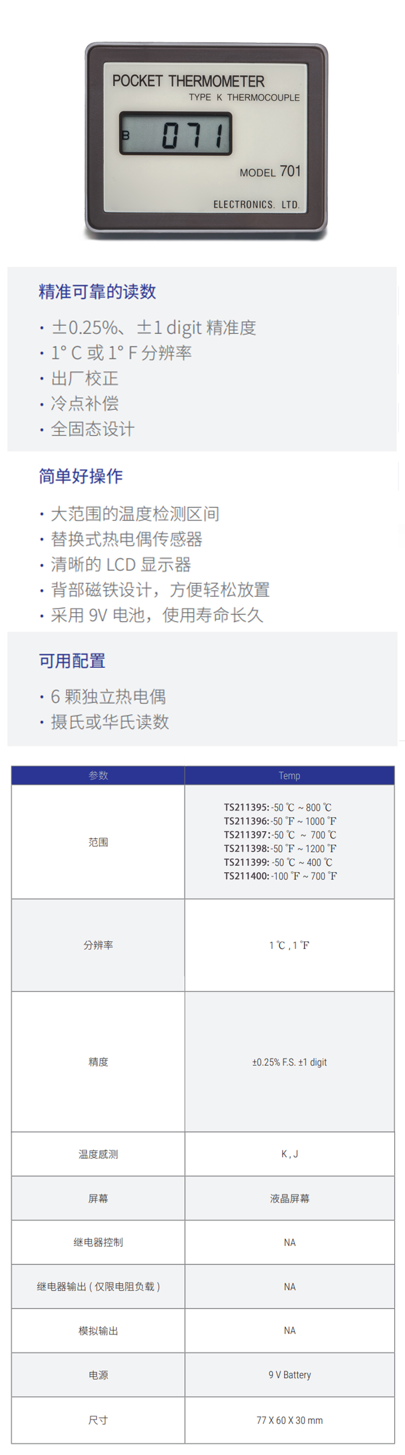 规格:  测温范围-50~700℃ 制造商型号:  TS211400