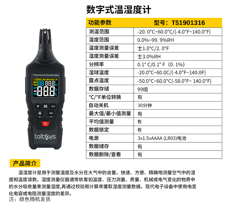 ·用于测量温度及水分在大气中的含量。快速、方便、精确地测量空气中的湿度和温度读数 ·湿度测量仪器通常依靠如温度、压力测量、质量、机械或电气变化的物质中的水分吸收量来测量湿度,再通过校验和计算来玃取湿度测量数掾 ·现代电子设备中使用电变化电容或电阻测量湿度的差异。