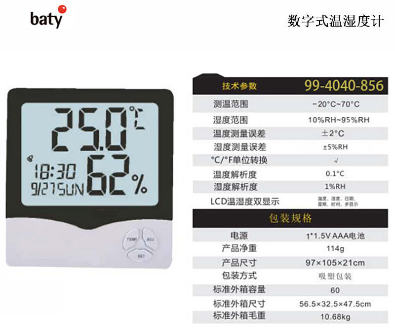 C70316 99-4040-856 -40~70℃ ±1.5℃ 20%RH~90%RH ±5%RH(5~40%RH) 数显温湿度计 82.50