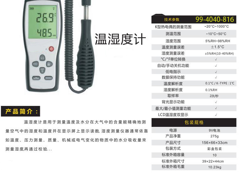 ·温湿度计是用于测量温度及水分在大气中的含量能精确地测量空气中的湿度和温度并在显示屏上显示读数,湿度测量仪器通常依靠如温度、压力测量、质量、机械或电气变化的物质中的水分吸收量来测量湿度,再通过校验...