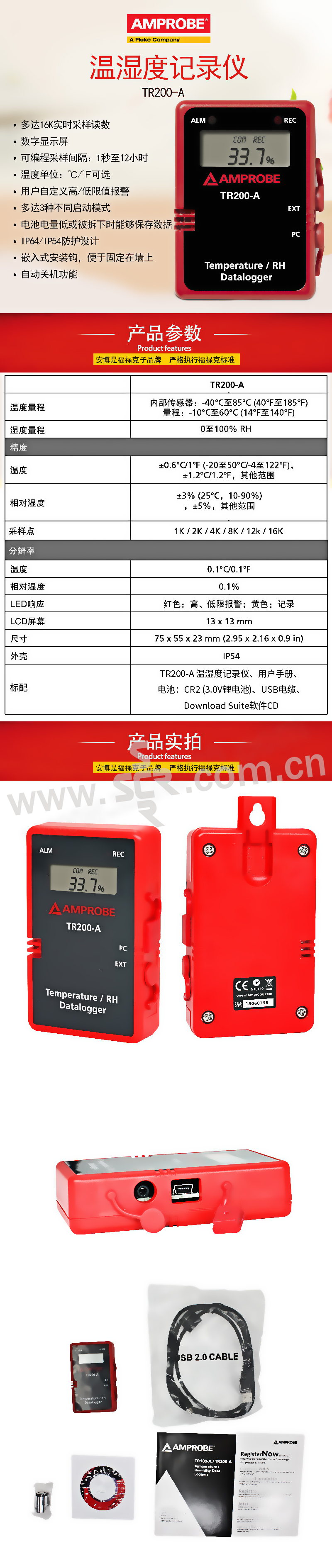 ·多达16K实时采样读数·数字显示屏·可编程采样间隔:1秒至12小时·温度单位:℃/℉可选·用户自定义高/低限值报警·多达3种不同启动模式·电池电量低或被拆下时能够保存数据·IP64/IP54防护设计·嵌入式安装钩,便于固定在墙上·自动关机功能
