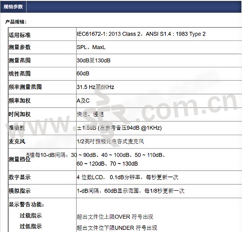 ·符合 IEC 61672-1等级2标准·可同时测量最大和峰值音量·动态范围60dB·5个档位自 30至130dB·A及C频率加权·快速、慢速时间加权·200M笔数据记录容量 (micro SD 卡 4GB)·USB界面·音量警告输出信号·内含日期时间功能