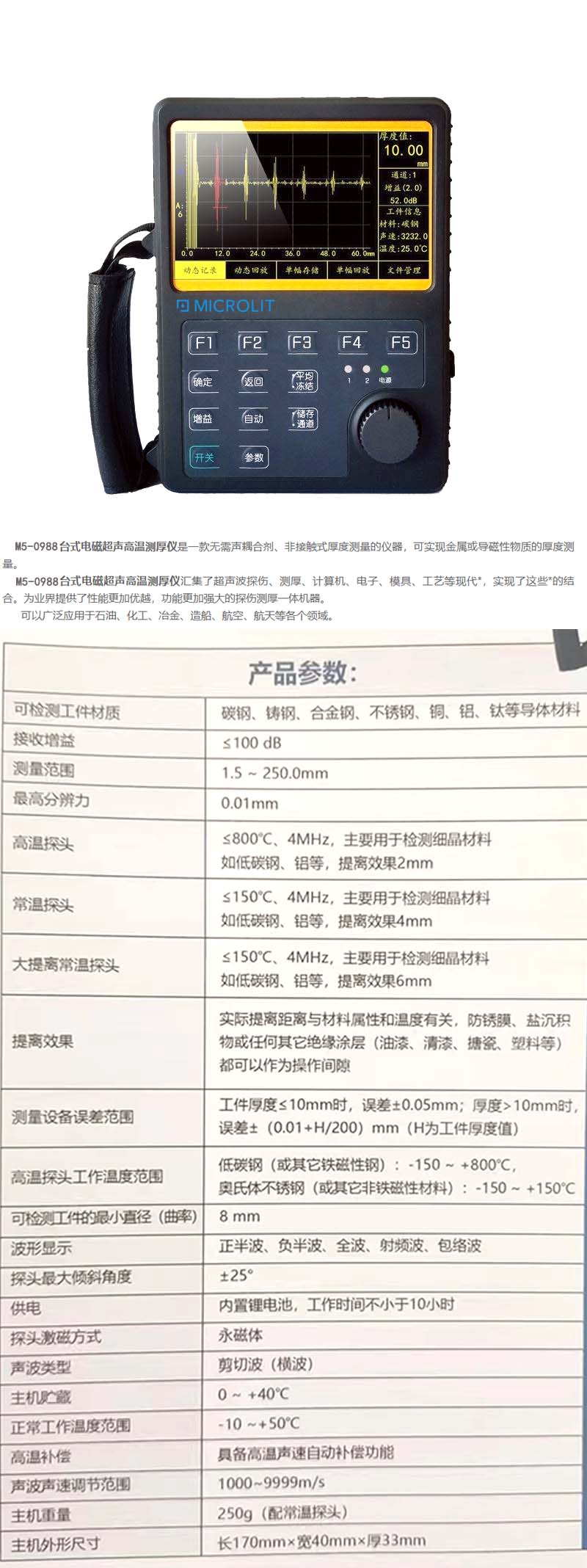 *仪器具有A扫描、B扫描两种功能,专业算法程序支持,测量结果精确。不需要耦合剂,不需要打磨工件表面,允许被检测表面有油漆、包覆层和凹凸不平等 *内置了一款红外非接触温度计MLX90614。TO-39 金属封装里同时集成了红外感应热电堆探测器芯片和信号处理专用集成芯片。由于集成了低噪声放大器、17 位模数转换器和强大的数字信号处理单元,使得高精度和高分辨度的温度计得以实现 *具备高温声速自动补偿功能,适用于高温管道,锅炉,压力容器场合测厚,无需被测对象冷却测量提高工作效率,广泛用于石油、化工、冶金、造船、航空和航天等领域