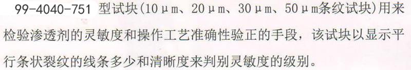 ·EN IS03452-3-I型试块(10 um、20 u m、30 u m、50 u m条纹试块)用来检验渗透剂的灵敏度和操作工艺准确性验正的手段,该试块以显示平行条状裂纹的线条多少和清晰度来判别灵敏度的级别。
