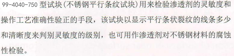 ·JB/T6064-D型试块(不锈钢平行条纹试块)用来检验渗透剂的灵敏度和操作工艺准确性验正的手段,该试块以显示平行条状裂纹的线条多少和清晰度来判别灵敏度的级别,也可用作渗透剂对不锈钢材料的腐蚀性检验。