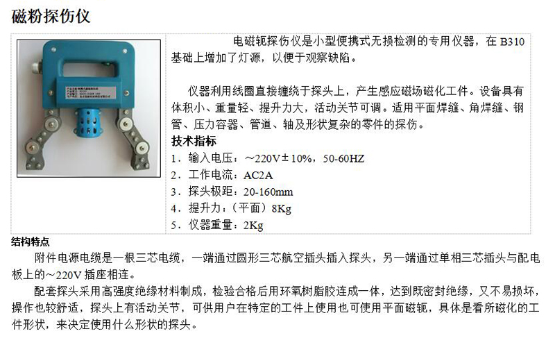 ·体积小、重量轻、提升力大和活动关节可调等特点,适用平面焊缝、角焊缝、钢管、压力容器、管道、轴及形状复杂的零件的探伤。