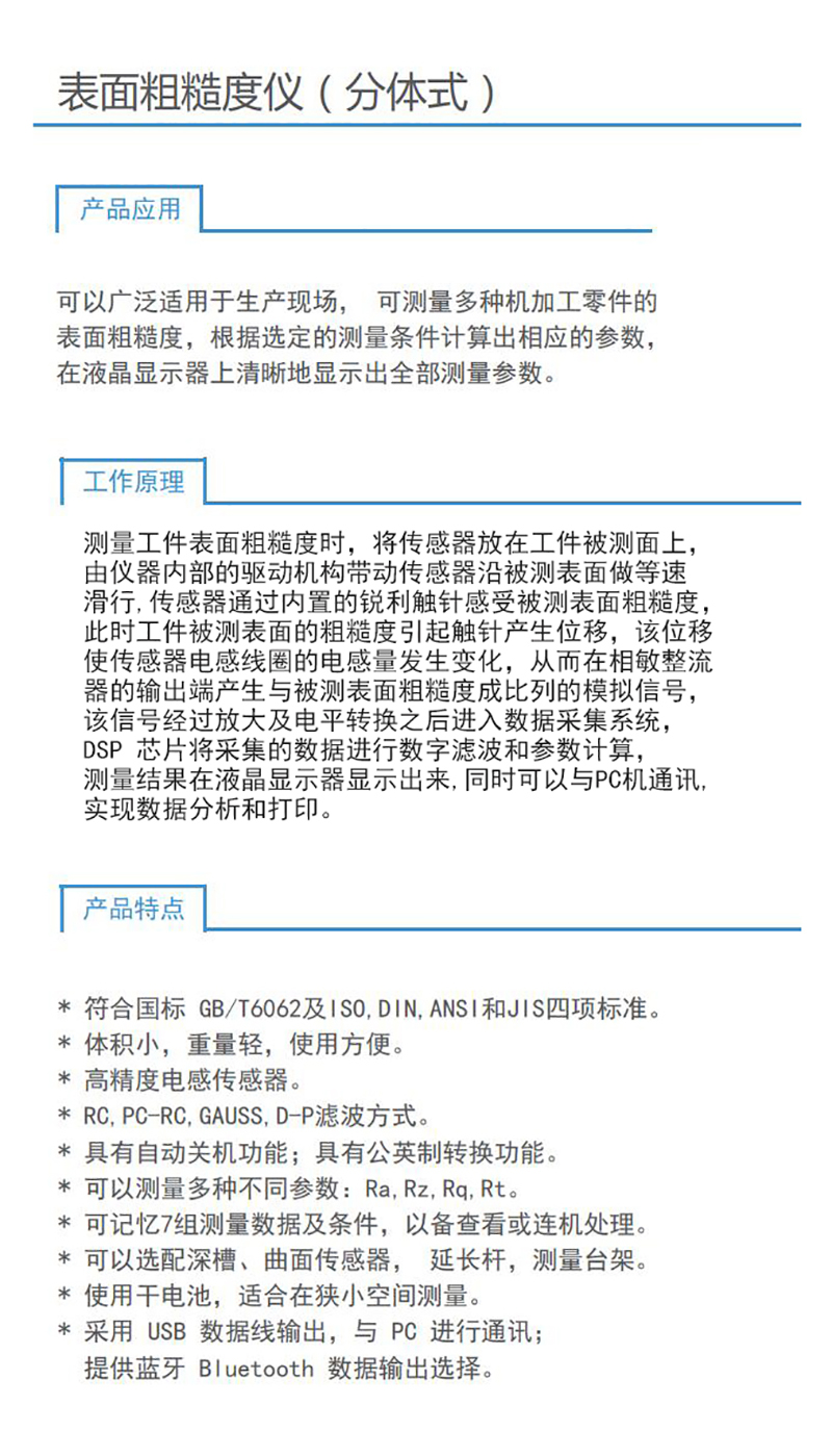 ·可测量Ra,Rz,Rq,Rt;具有RC,PC-RC,GAUSS,D-P四种滤波方式;可记忆7组测量数据。