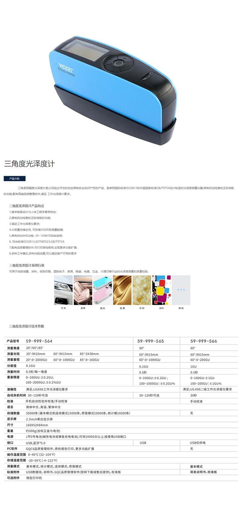 B80809 59-999-564 20°:0~2000GU,60°:0~1000GU,85°:0~160GU 光学 ·0~ 100GU:±0.2GU;100~2000GU:±0.2%GU 测量角度 20° 60° 85° 0.1GU 7590.00