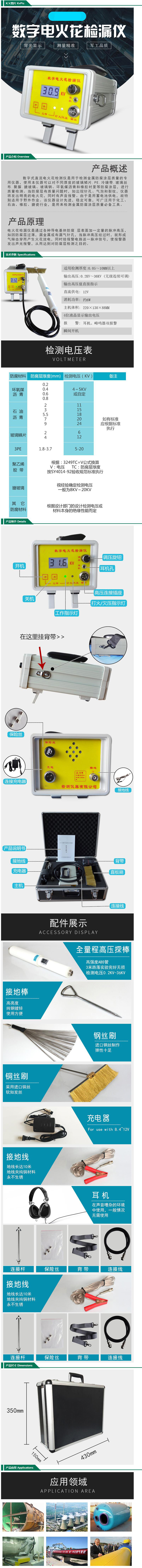 ·KF-35型数字式直流电火花检测仪是用于检测金属防腐涂层质量的专用仪器,使用本仪器可以对不同厚度的玻璃鳞片.PE.冷缠带.玻璃丝布.聚脲.搪玻璃、玻璃钢、环氧煤沥青和橡胶衬里等防腐涂层,进行质量检测。当防腐层有质量问题时,如出现针孔、气泡和裂纹,仪器将发出明亮的电火花,同时有声音报警。由于是用蓄电池供电,故特别适用于野外作业。该仪器设计先进,稳定可靠,可广泛用于化工、石油、橡胶、搪瓷行业,是用来检测金属防腐涂层质量必备工具。