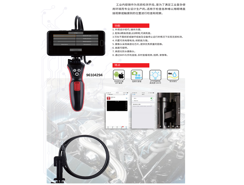 ·外观设计轻巧,操作方便。 ·配有6颗高亮度LED照明,可调亮度。 ·可在不需拆卸或破坏组装及设备停止运行的情况下实现无损检测。 ·内置可充电锂电池,续航能力强。 ·摄像头采用高感光芯片,提供优秀质量的图像。 ·画面可旋转。 ·高感光防水摄像头。 ·通过WiFi与手机连接,实时查看视频.拍照.录像等。