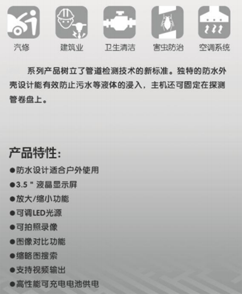 ·自适应图像处理功能,应对不同大小空间与抛光情况; ·360度全方位转向系统、无延时; ·模块化的可更换设计,主机可一键分离,可同时支持多种管线系统;