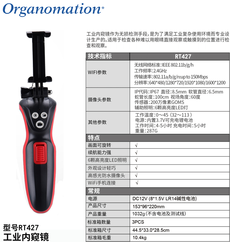 ·外观设计轻巧,操作方便; ·配有6颗高亮度LED照明,可调亮度; ·可在不需拆卸或破坏组装及设备停止运行的情况下实现无损检测; ·内置可充电锂电池,续航能力强; ·摄像头采用高感光芯片,提供优秀质量的图像; ·画面可旋转; ·高感光防水摄像头; ·通过WiFi与手机连接,实时查看视频、拍照、录像等。