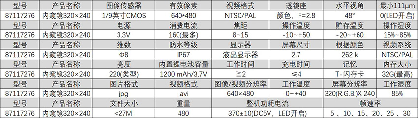 ·产品特征: ·视频录制功能,支持32GB的微型SD卡 ·8mmIP67防水摄像头1[3ft〕柔性延长管 ·易于测量小和难以到达的地方;4.OSD菜单操作 ·2.7英寸TFT彩色监视器,亮度可调