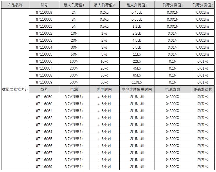 A35559 87116069 500N 50kg 110Lb 0.1N 0.01kg 0.01Lb 内置式 ±0.5% 3.7V锂电池 4-6小时 约15小时 ≥300次 输入: AC220V 50HZ输出: DC 5V 1000mA 5℃-35℃ -10℃-60℃ 15%-80%RH 周围无震源及腐蚀性介质 1540.00