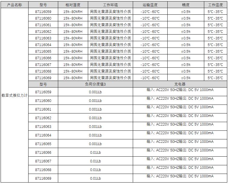 A35555 87116065 50N 5kg 11Lb 0.01N 0.001kg 0.001Lb 内置式 ±0.5% 3.7V锂电池 4-6小时 约15小时 ≥300次 输入: AC220V 50HZ输出: DC 5V 1000mA 5℃-35℃ -10℃-60℃ 15%-80%RH 周围无震源及腐蚀性介质 1540.00
