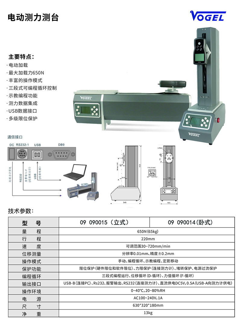 ·多种操作模式:手动,自动循环,RS232,设定点演示(教学与播放) ·多输出输入:USB ·多重保护:力量计设定值,限位开关,锁定转子 ·力量表数据集成能力