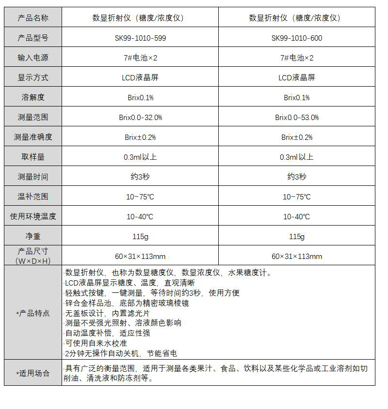 ·数显折射仪,也称为数显糖度仪,数显浓度仪,水果糖度计。 ·LCD液晶屏显示糖度、温度,直观清晰 ·轻触式按键,一键测量,等待时间约3秒,使用方便 ·锌合金样品池,底部为精密玻璃棱镜 ·无盖板设计,内置滤光片 ·测量不受强光照射、溶液颜色影响 ·自动温度补偿,适应性强 ·可使用自来水校准 ·2分钟无操作自动关机,节能省电