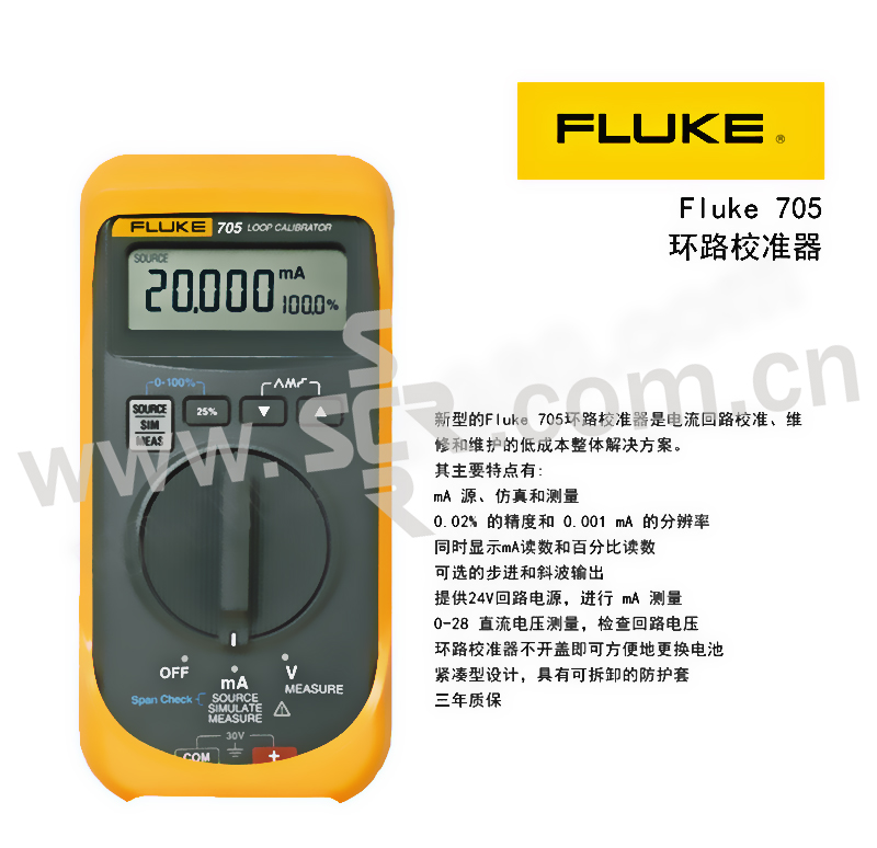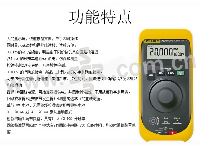 ·大显示屏,简单按钮界面,使用方便环路校准器同时显示 mA 和百分比读数,可快速、简便地读取测量结果·0.02% 的mA 准确度·按下按钮时,以25%的步长进行快速、简便的线性度检查。比传统的旋钮节省大量时间。·"跨度检查"功能,可快速检查零点和跨度·环路校准器可选慢速、快速斜坡、步进功能,提供连续平滑输出以测试环路和阀滑动。·24 V的内置回路电源,可给变送器供电,并测量其输出,不用携带数字多用表。·更换方便的单节 9V 电池