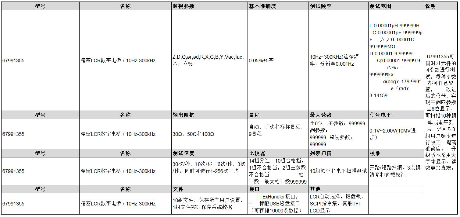 ·可同时对元件的4参数进行测试 ·每种参数都可任意配置 ·全新改进后的仪器,实现主副四参数全6位显示,可扫描10种频率或电平列表,可对3组用户频率进行校正,提高准确度。 ·新升级版本采用大字体显示,读数更加直观。 ·LCR自动选择,键盘锁,SCPI指令集,真彩TFT-LCD显示