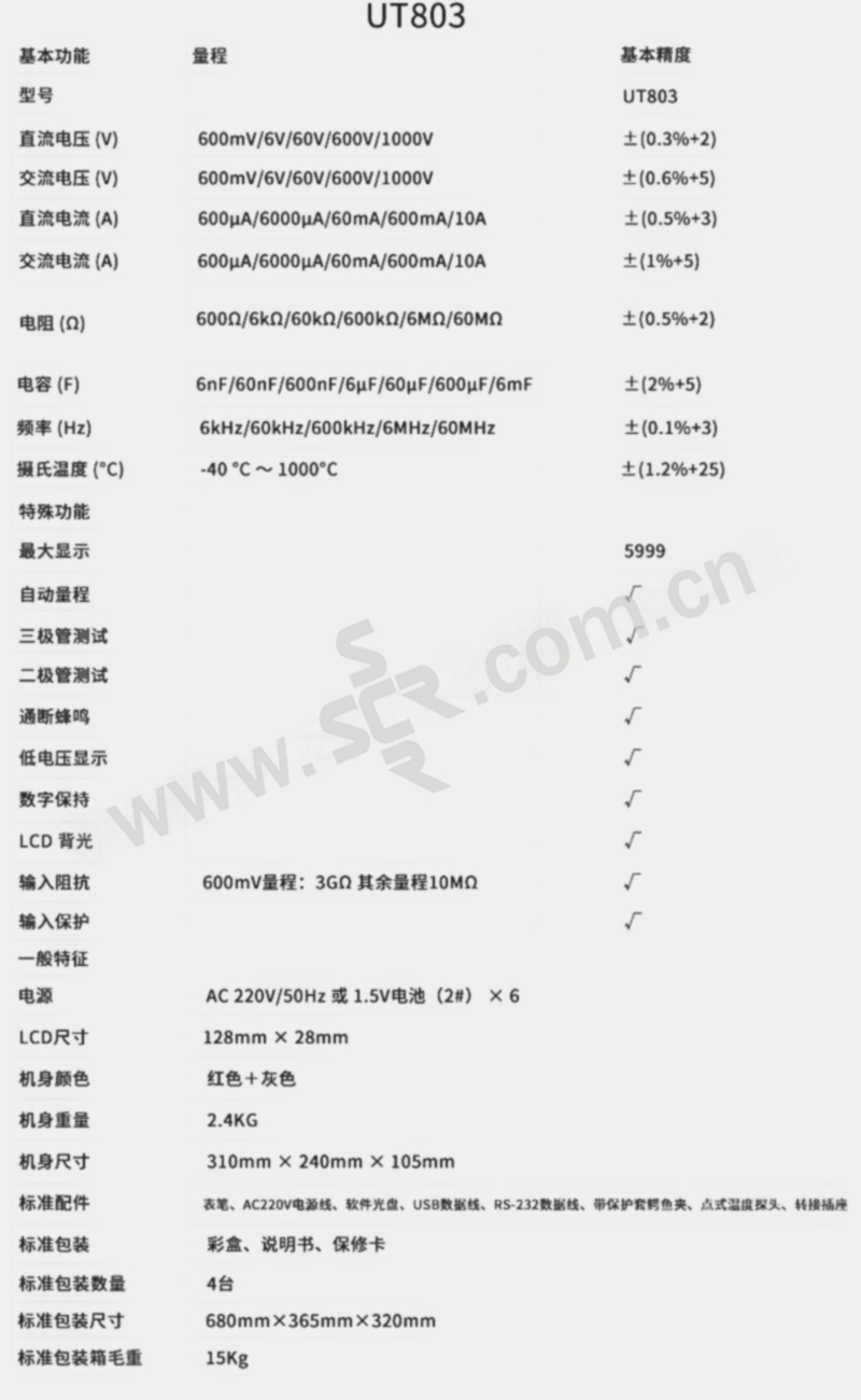 ·UT803 是5999计数的自动量程真有效值数字台式万用表。具有全功能显示,全量程过载保护和独特的外观设计,使之成为更为优越的电工测量仪表 ·内置供电系统适用于AC 220V或二号电池/R14(1。5V×6节)和RS-232和USB数据传输接口。 ·适用于、电子、通讯、制造、石油、国防、电力、化工等行业的测量,是各类大专院校实验必备的实验工具。