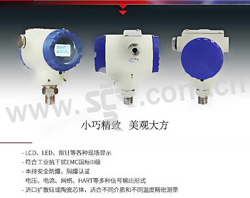·进口扩散硅或陶瓷芯体,适用不同的介质的压力液位测量·激光调阻温度补偿,使用温域宽,测量准确度高·过压过流反向级性电路保护,可靠性高·电压、电流、网络、HART,无线等多种输出方式·可以带LCD、LED、指针等各种现场显示·符合工业抗干扰EMC国标三级