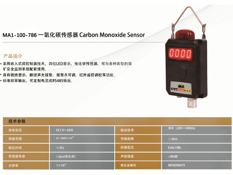 ·采用嵌入式微控制器技术,四位LED显示,电化学传感器,可与各种类型的煤矿安全监测系统配套使用。
