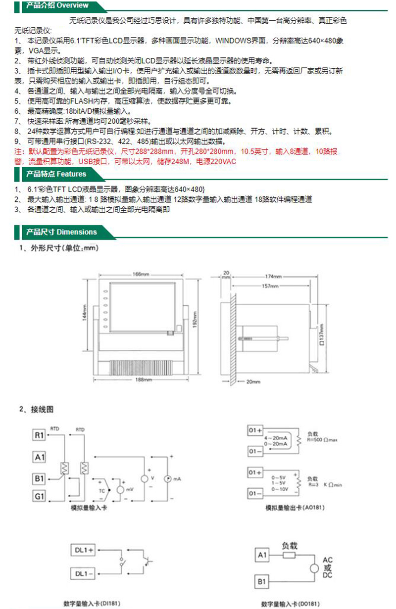 ·6.1′彩色TFT LCD液晶显示器,图象分辨率高达640×480 ·最大输入输出通道: 1 8 路模拟量输入输出通道 12路数字量输入输出通道 18路软件编程通道 ·各通道之间、输入或输出之间全部光电隔离即