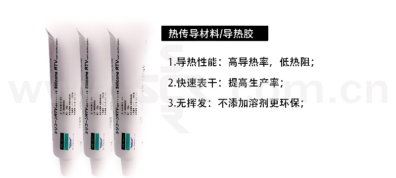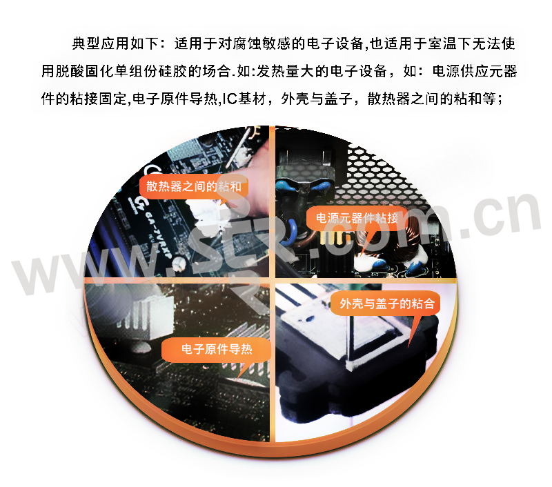 ·高导热性:具有高导热性能,适用于需要导热粘接的场合。·脱醇型:固化反应的副产物为醇类,对基材无腐蚀。·快速表干:提高生产效率。·通用性强:对大多数基材都有良好的粘接效果。·精炼型:通过小分子精炼使本品可用于精密元器件上,不会对元器件造成腐蚀。·阻燃性能:通过UL94-V0阻燃认证。